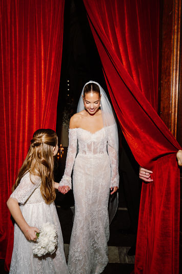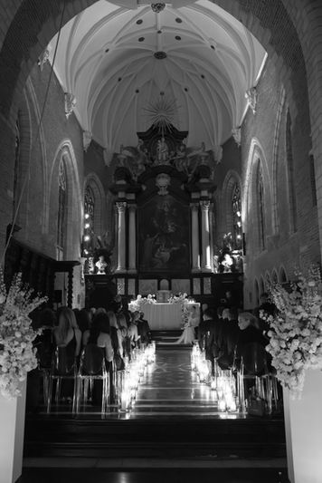 The story started with a red themed pre wedding dinner with just their intimate friends and family. Followed by the wedding day where the guests were welcomed in the chapel of the venue that was lit by a sea of candles and with the piano playing in the background... the ceremony started. While the guests were guided to the reception, our team prepared the dinner table. The dinner took place in a ballroom covered in drapery and candles lit up the dining table. It was stunning!
